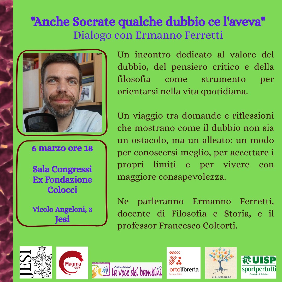 L’appuntamento prende spunto dalla figura di Socrate e dal valore del dubbio come strumento di conoscenza, per riflettere sul ruolo del pensiero critico nei processi educativi contemporanei. In un contesto sociale attraversato da polarizzazioni, semplificazioni e narrazioni rigide, l’iniziativa intende valorizzare la capacità di interrogarsi e mettere in discussione automatismi culturali aprendo spazi di dialogo.