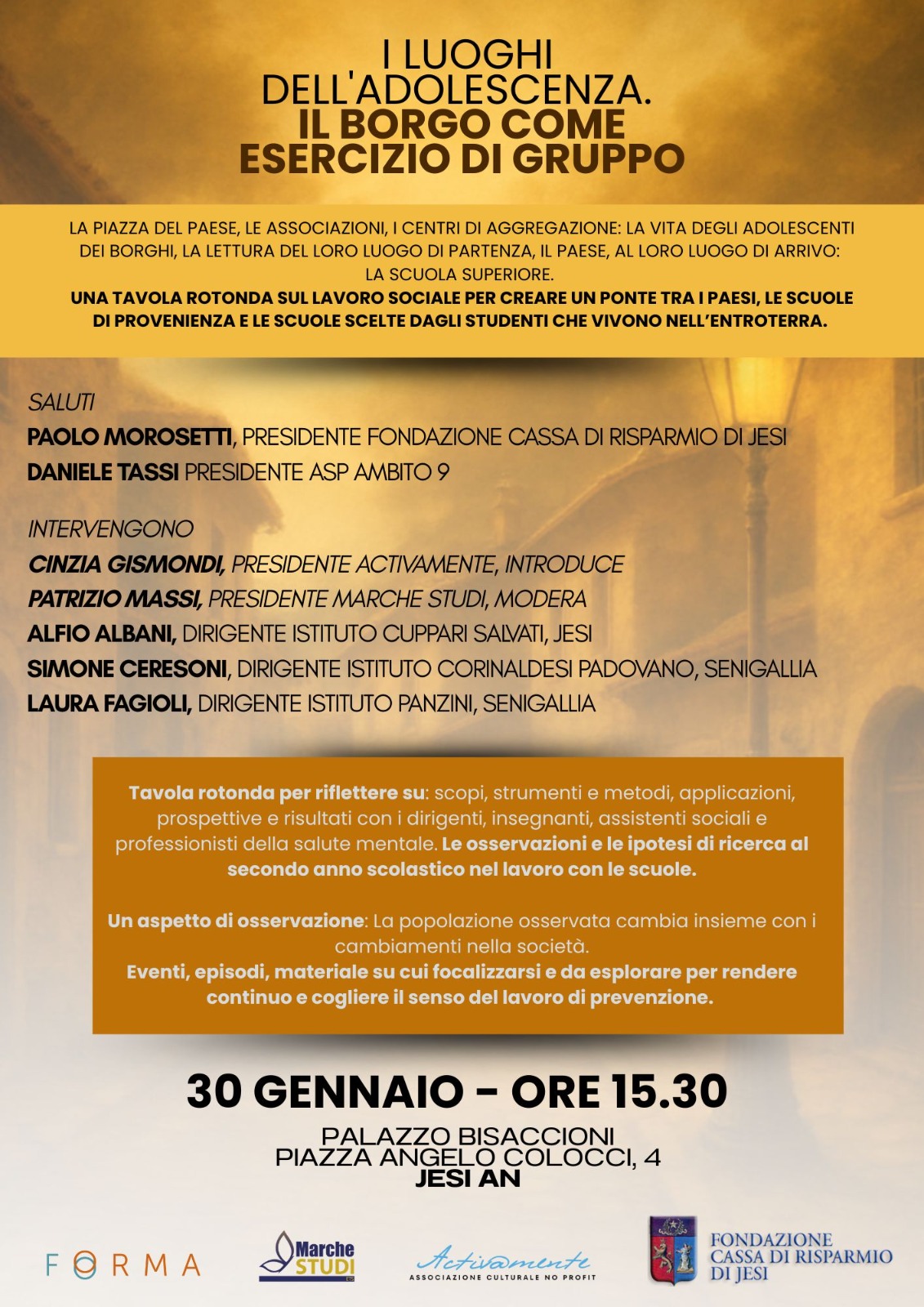 Dopo i saluti istituzionali di Paolo Morosetti, Presidente della Fondazione Cassa di Risparmio di Jesi, e Daniele Tassi, Presidente ASP Ambito 9, interverranno Cinzia Gismondi, Presidente di Activamenete, Patrizio Massi, Presidente di Marche Studi ETS, Alfio Albani, Dirigente dell'Istituto Cuppari Salvati di Jesi, Simone Ceresoni, Dirigente dell'Istituto Corinaldesi Padovano di Senigallia, e Laura Fagioli, Dirigente dell'Istituto Panzini di Senigallia. Modera Patrizio Massi.